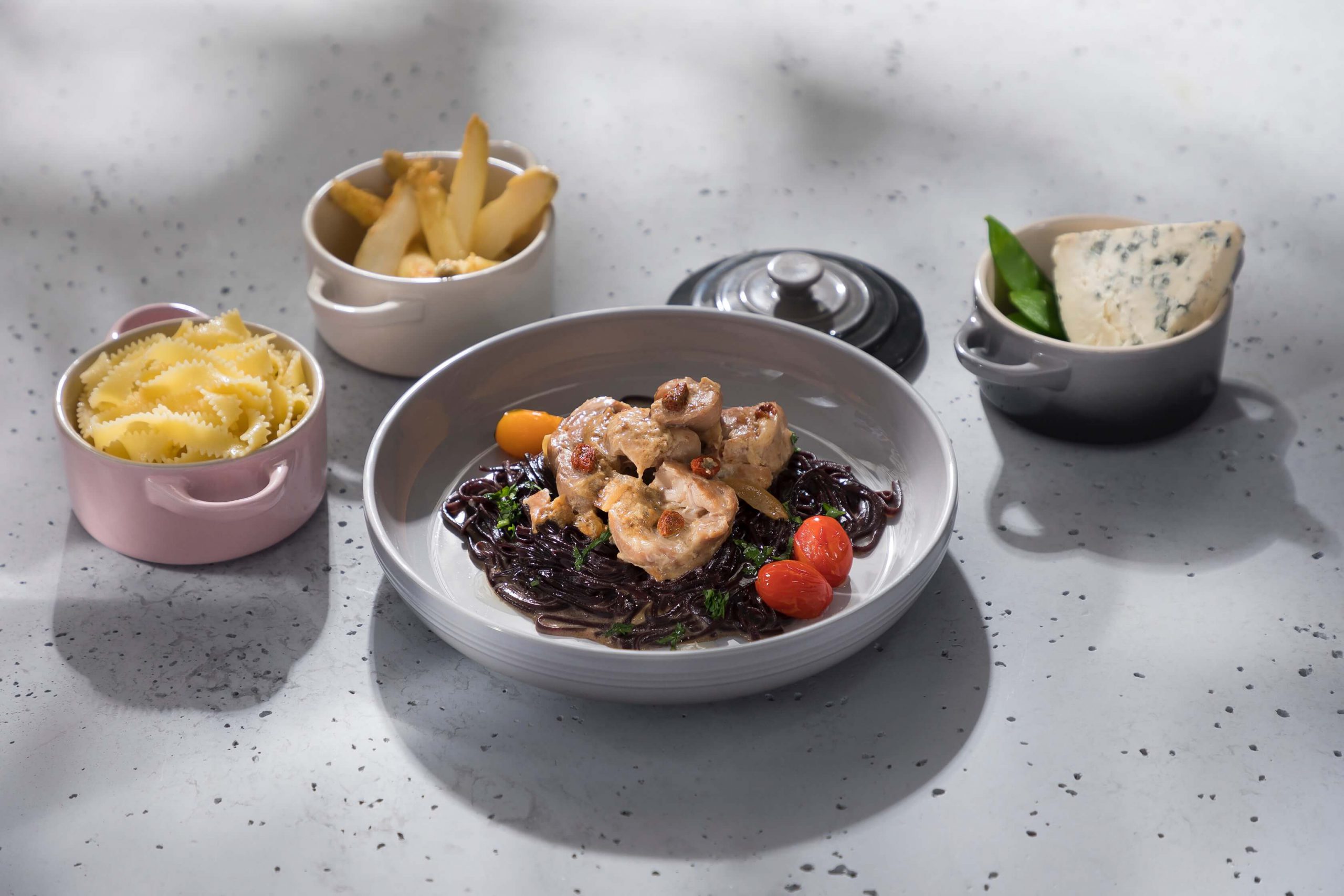 udo z kurczaka zagrodowego (200g), ser pleśniowy Dorblue, śmietana, masło, ziarna goi, cebula, czosnek, sól kłodawska, żelatyna.